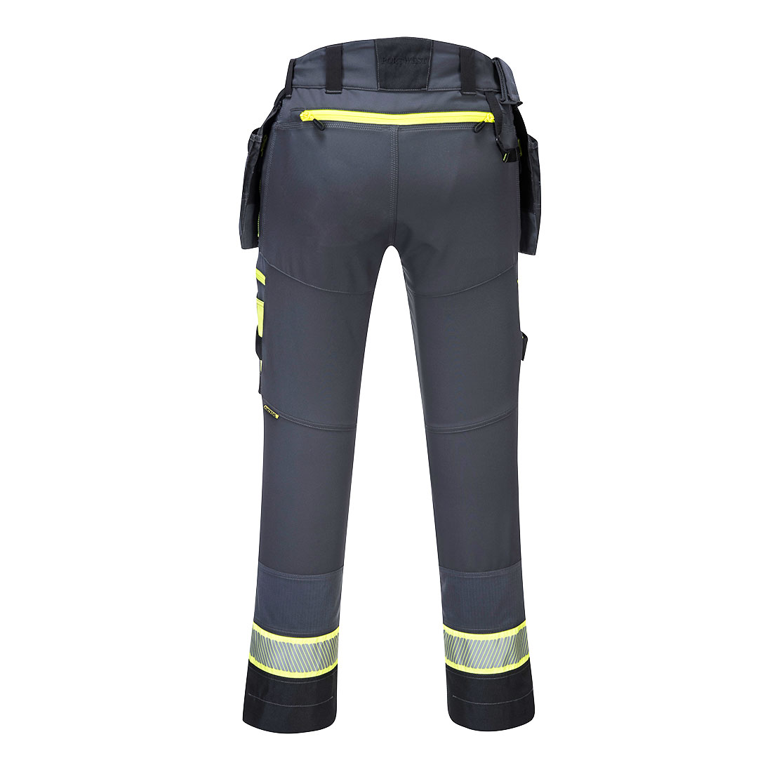 Delovne hlače na pas DX440 so zasnovane za tiste, ki pri delu zahtevajo najvišjo raven udobja, gibljivosti in zaščite. Izdelane so iz napredne 4-smerno raztegljive tkanine (4X stretch), ki omogoča popolno svobodo gibanja in ohranja udobje tudi pri dolgotrajni uporabi. Hlače imajo povišan pas z elastiko ob straneh, ki nudi zaščito in udobje v vseh položajih dela. Hlače so zelo funkcionalne tudi zato, ker imajo z zadrgo odstranljive viseče žepe, ki se omogočajo prilagoditev glede na potrebe uporabnika. Hlače DX440 imajo 16 žepov, vključno z velikimi sprednjimi žepi, večnamenskimi žepi z zadrgo, ojačanimi CorePro žepi, žepom za kladivo, varilnim žepom ter žepi za ščitnike kolen z dvema možnostma namestitve, ponuja izjemno organizacijo in praktičnost pri delu. Zanke za orodje in ključe omogočajo varno in organizirano shranjevanje delovnih pripomočkov. Sodobna zasnova z kontrastnimi elementi, odsevnimi elementi in tehničnim krojem združuje profesionalen videz in visoko učinkovitost. Hlače imajo možnost podaljšanja robov hlačnic in se tako lahko prilagodi dolžina.
